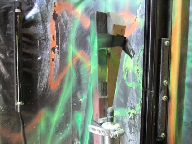 Todos los paneles de madera contrachapada son inicialmente aerosol pintado en negro y luego los colores de neón se utilizan para hacer los diseños.