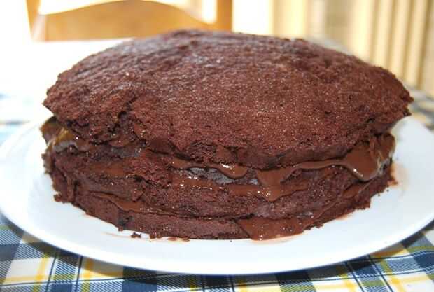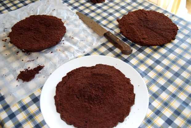 Agua cada rebanada con el chocolate con leche que acaba de hacer y con un cuchillo húmedo, corte el pastel en 3 rodajas (incluso 4 si es lo suficientemente alto).