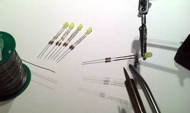Para hacer cada vela, necesitas soldar 100 o 110Ω resistencia a cada pata del LED. Las resistencias son necesarias limitadores de corriente para el LED y preven la altura de la vela. También permiten la vela ser conectado directamente a la cabecera en el Arduino.