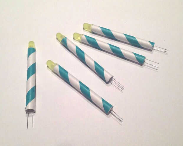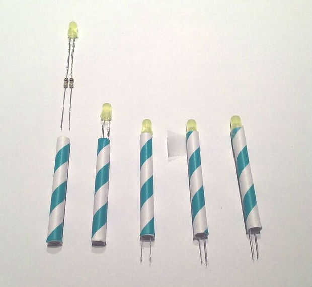 Una vez que la soldadura se realiza para cada LED, mida y corte una sección de papel paja para cada vela que permite el LED para sentarse a ras en un extremo con las resistencias dentro y 1/4 de pulgada o un poco más de la resistencia lleva que sobresale desde el otro extremo.