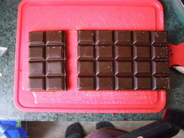 Chips de chocolate: tomar alrededor de la mitad de la barra de chocolate (esto podría ser más de la mitad de una taza pero cuantos más mejor!) Romper en cuadrados, luego con un cuchillo, pulse en la casilla y el cuchillo hacia adelante y hacia atrás hasta que la plaza se rompe en dos. También puede ver las piezas en la mitad, pero encontré que era difícil de hacer, e hizo todas esas virutas de chocolate pequeña cuando quería pedazos. Repita en las dos mitades que se puso al lado de uno para que usted obtenga los cuartos. PLOP a la masa y continuar.