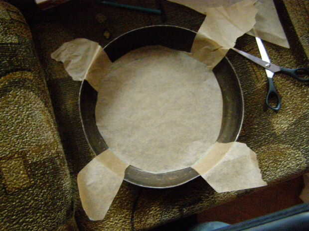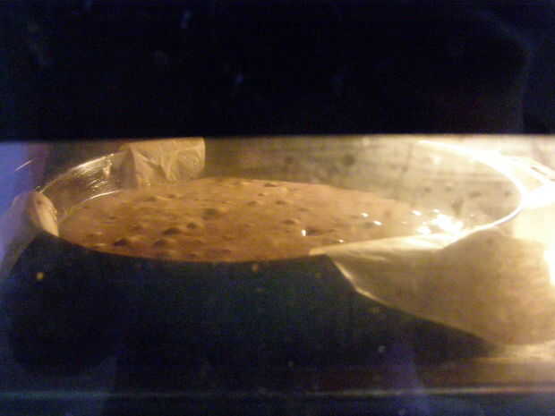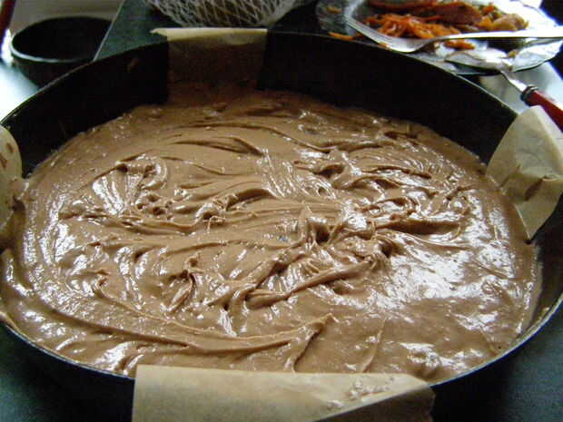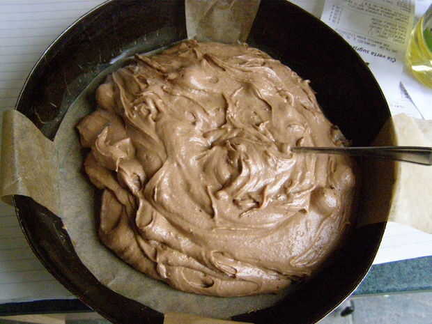 Ahora es el momento para verter la mezcla en la sartén. No se extendió hacia fuera (o lo hará muy lentamente) así que ayudar con una cuchara o una de las espátulas de separarse. Debe cocinar por 40 minutos pero tienes trabajo que hacer durante ese tiempo! Cuando esté hecho, probarlo por que se pega un palillo en y ver si sale limpio. Si lo hace, se hace la torta! Tenga cuidado al sacarlo, el medio inflado hasta puede hundirse fácilmente. En lugar de tener una montaña, nuestra tarta tendrá un valle.