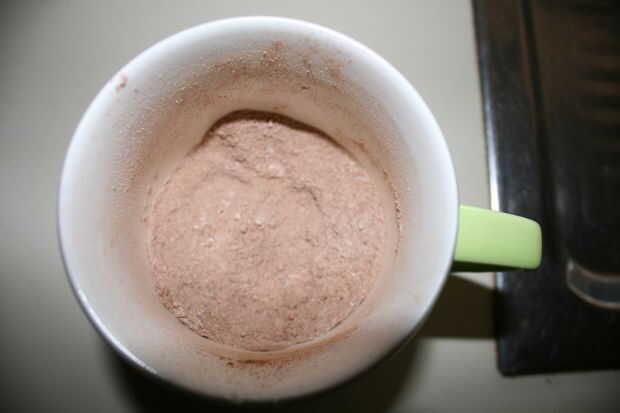 primero agregue 4 cucharadas de harina, 4 cucharadas de azúcar y 2 cucharadas de cacao en polvo en la taza de café y mezclar bien