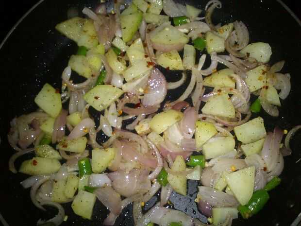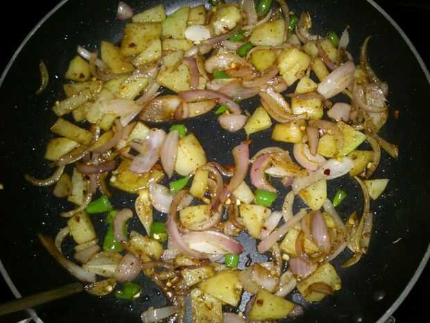 -Después del paso anterior, agregar las papas cocidas y continúe friendo