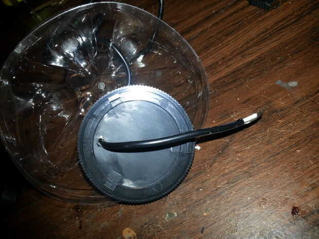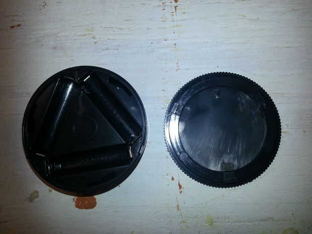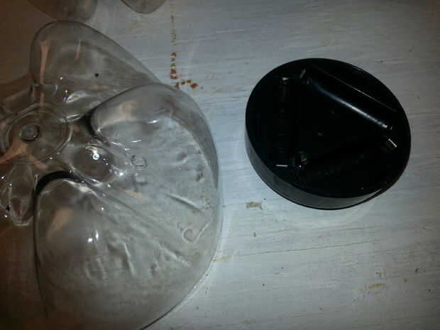 Desenrosque la tapa de la pila en la parte posterior de la luz. Perfore un agujero a través de una del lado de los pies de la parte inferior del fondo de la botella pop a cortar y a través de la tapa de la puerta.