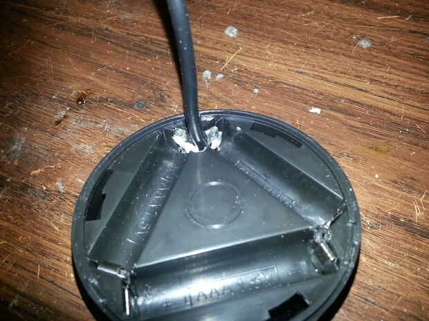 Corte cualquier enchufe está en el extremo de la cuerda, mina fue un micro USB, no necesita esto. Tire del extremo del alambre por los agujeros que ha perforado. Tira la caja aproximadamente 1/4 una pulgada. Para la mayoría de fuentes de alimentación suelen tener un red(hot) y un cable negro. Suelde el cable rojo a la + de la terminal de la batería y el negro al - lado.