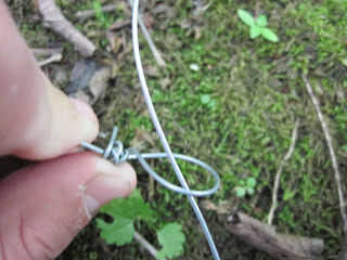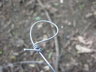 Aunque las fotos de arriba es el cable, puede hacer lo mismo a paracord. Envuelva el paracord alrededor de un palillo o un dedo haciendo un pequeño lazo. Atar el lazo pequeño y sacar su dedo. Asegúrese de que el nudo es muy fuerte. Coloque el otro extremo de la paracord a través del pequeño lazo, como la foto de arriba. Entonces debe tener un lazo gigante, conocido como la caja sí mismo. Hacer el loop (lazo) diámetro ligeramente más pequeño que el diámetro de su agujero. Atar el lazo extra línea alrededor de un árbol, Arbolito o troncos cerca por. Asegúrese de que lleva a cabo. Coloque la trampa sobre el agujero en la parte superior el "camuflaje".