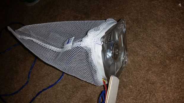 Simplemente coloque la bolsa en la parte posterior del ventilador. Usted puede decidir utilizar bandas de goma o cinta para sostenerla en lugar.