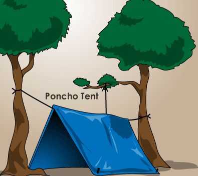 Atar el cable a través de dos árboles o dos palos que ha puesto en la tierra. Te tiran un poncho sobre el cable y asegúrese de que tiene! Obtener cuatro palos, afilar el extremo de cada palo y hacerlos puntiagudos. Los cuatro de sus palos puntiagudos empuje a la tierra donde están las cuatro esquinas del poncho. Que debe permitir que mantenga. Su refugio debe buscar mirada que arriba.