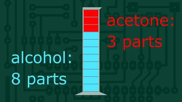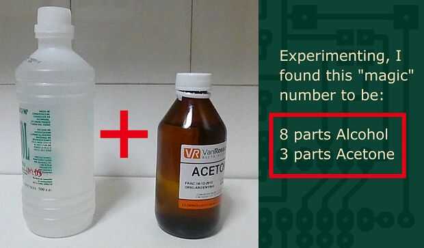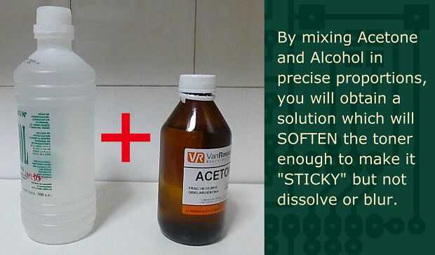 Experimentalmente he encontrado la mejor proporción de alcohol-acetona es 8:3 (8 volúmenes de alcohol + 3 volúmenes de acetona) acetona "ablandará" el toner lo suficiente como para que sea "pegajosa" pero no disolver o desenfoque.
