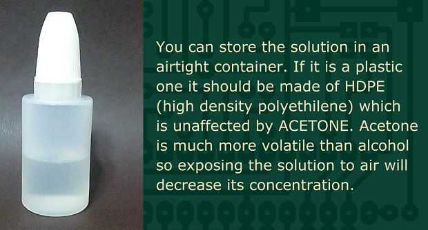 Puede guardar la preparación durante un tiempo muy largo, pero el recipiente debe ser absolutamente hermética. La acetona es mucho más volátil que el Alcohol para exponer al aire se degradará en concentración de acetona. El contenedor también debe sobrevivir a la acción de la acetona. Si plástico, debe ser polietileno de alta densidad(polietileno de alta densidad, a menudo utilizado en utensilios de cocina)