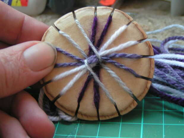 Enhebrar los hilos a través del telar, los arreglaron en pares de oposición - dos hebras blancas enfrente de dos blancos, dos púrpura púrpura dos opuesto etc..