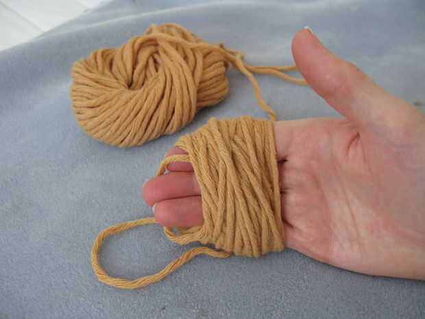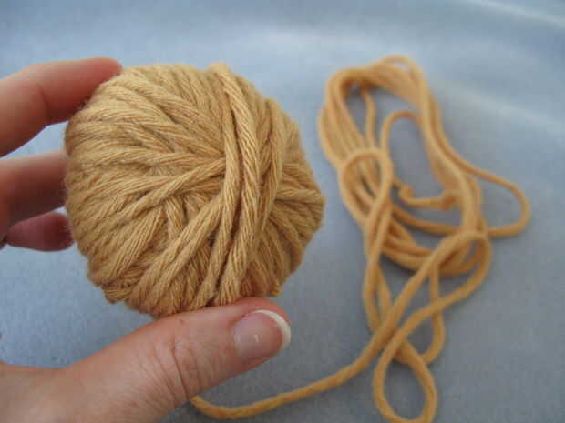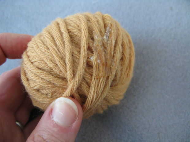Con el hilo restante, hacer una forma esférica. Envuelva el hilo alrededor de sus dedos varias veces, use aproximadamente 1/3 de la izquierda sobre el hilado. Luego, deslice el hilo de los dedos y usar los restantes 2/3 para envolver la bola de hilo en un movimiento circular hasta que toda la izquierda sobre el hilado se utiliza en la forma esférica. Esta forma esférica será la cabeza de su pulpo. Pegue el extremo del hilo hacia abajo con la pistola encoladora.
