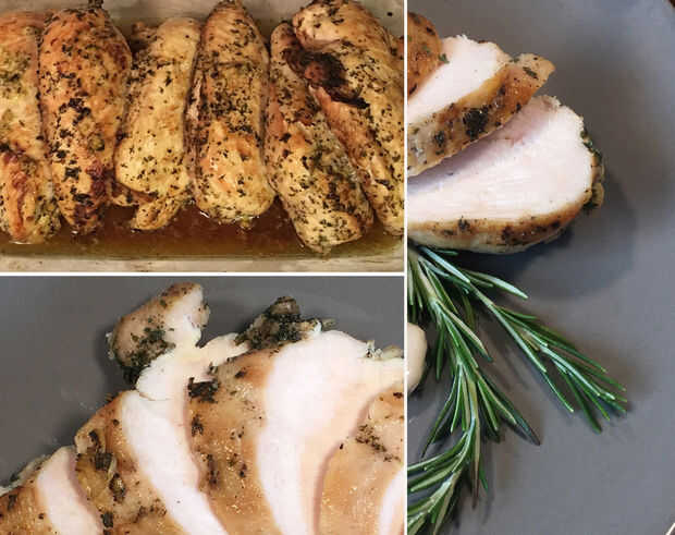 - Corte de 6 a 8 onzas gran aldaba de pollo con hierbas de la rebanada en diagonal (corte de ángulo de 45 grados) y colóquela sobre la cebolla roja que cubre la longitud del rodillo inferior.
