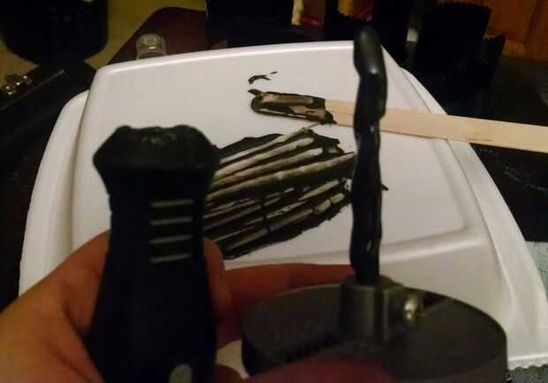 Mezclar una buena cantidad de JB Weld (mi favorita 2 parte pegamento cuando se trata de algo que haz utilizado y abusado) ya que hay una gran cantidad de espacio entre la espiga de la broca de taladro y el interior las paredes de la manija. Unte sobre la broca y con cuidado, llenar el vacío de la manija con ella. El giro de la broca le dará un montón de superficie para realmente celebrar juntos una vez curado.
