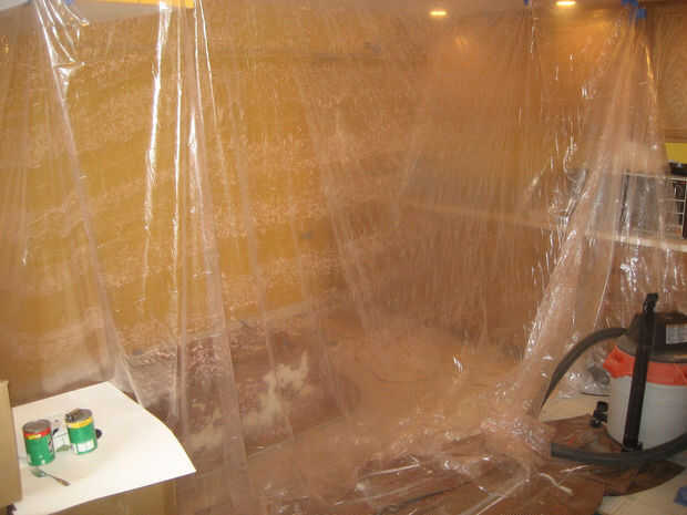 Si tu tina tiene un montón de capas de pintura y óxido en el exterior, usted se estar generando mucho polvo con el raspador y la lijadora, hasta sellar su área de trabajo con las láminas de plástico. Utilice la cinta para fijar la chapa al techo y colgar con suficiente para doblar bajo su dropcloth o lona. Asegúrese de dejar una abertura en la chapa para que pueda entrar en su área de trabajo.