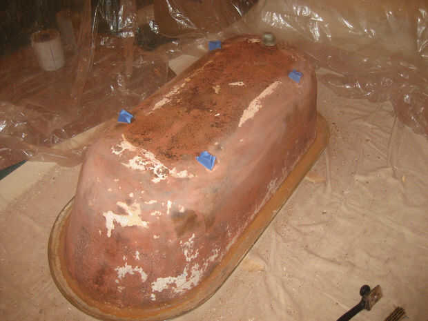 Como mencionamos anteriormente, nuestra bañera tenía varias capas de pintura sobre ella. Si el tuyo está en condiciones similares, usar el raspador de pintura para tira todo lejos de la pintura vieja. Dependiendo de qué tipo de bañera que tiene, puede que desee a la mascarilla y gafas protectoras antes de comenzar. Después de terminar de pelar lejos la mayoría de la pintura, circulan por el exterior con la lijadora eléctrica Palma hasta que todos los de la pintura se ha ido y su superficie es bastante uniforme. Si el exterior de la bañera parece la superficie de Marte cuando haya terminado, no se preocupe. Esto no necesita ser culo de bebé suave--es la parte exterior de la bañera. Utilice el cepillo de alambre y una toalla de papel húmeda para limpiar cualquier exceso de polvo.