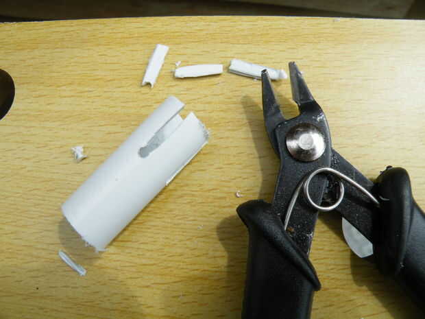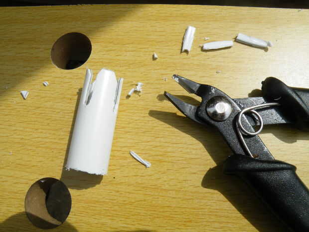 Utiliza un par de cortadores de alambre para cortar desde el extremo de la tubería a los orificios perforados, haciendo cuatro lengüetas en el extremo de la tubería.