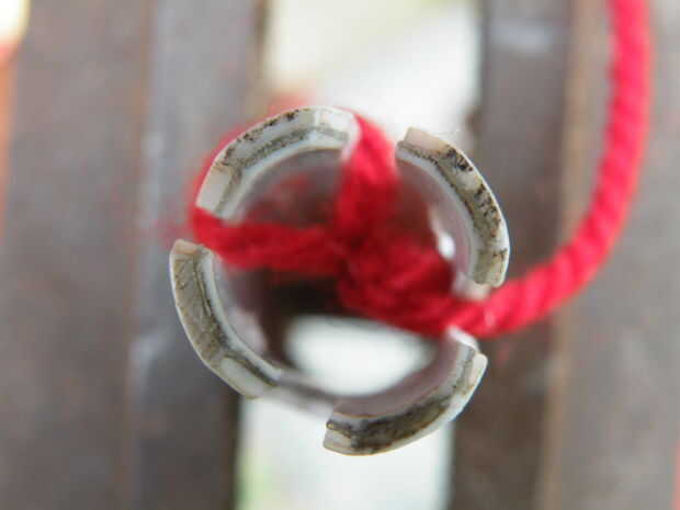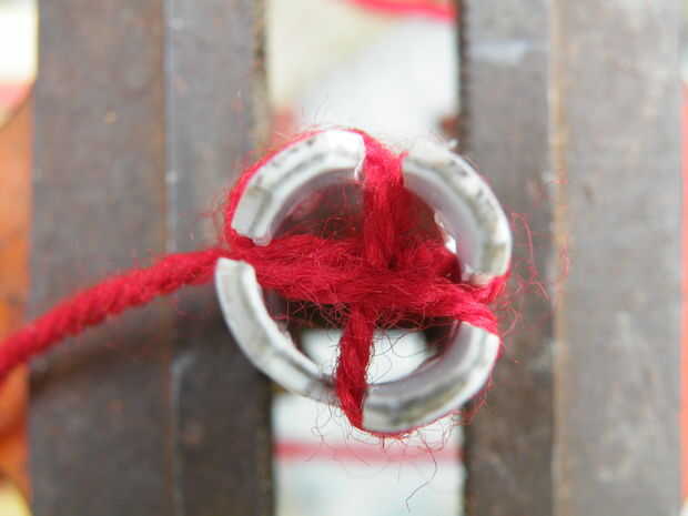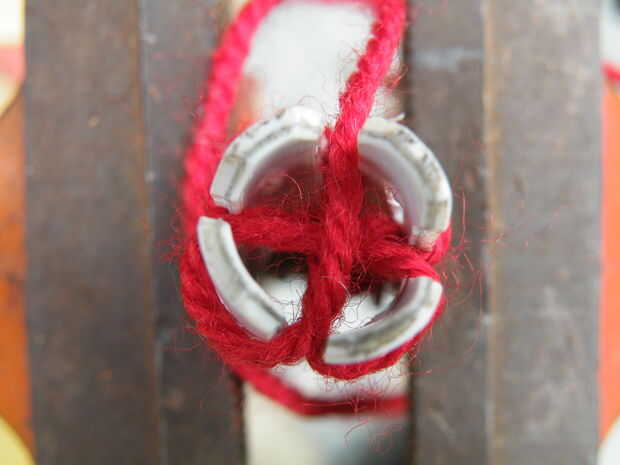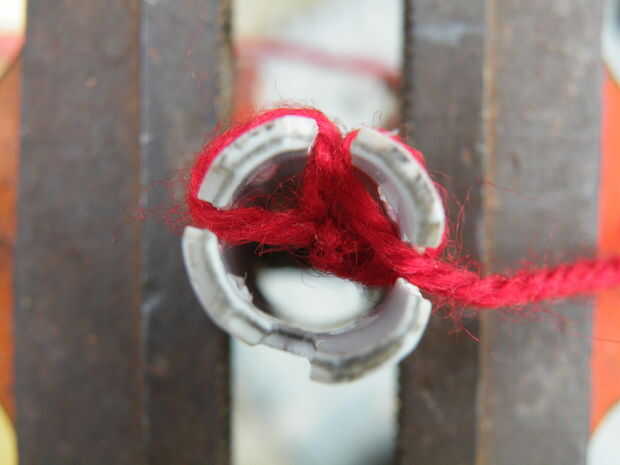 Tomar el hilo y ate un lazo pequeño a pocos centímetros del extremo. Bajar el extremo suelto hacia abajo el tubo (debe colgar en el extremo del tubo un poco) y colgar el lazo sobre una de las pestañas.