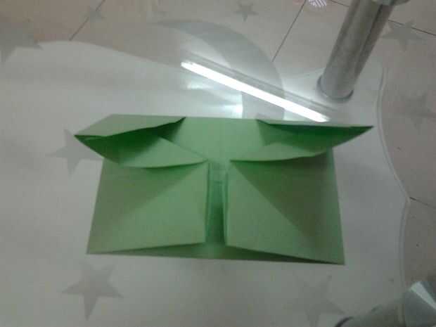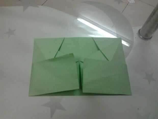 2, para que veáis todo dentro. Si usted quiere ahora sería un buen momento para doblar hacia atrás la parte inferior 1/4 con el pliegue ya hecho para que usted no tiene que deshacer todo más tarde. Cuando te retiras las partes delanteras de la vuelta otra vez, traiga las piezas que parecen solapas hacia fuera...