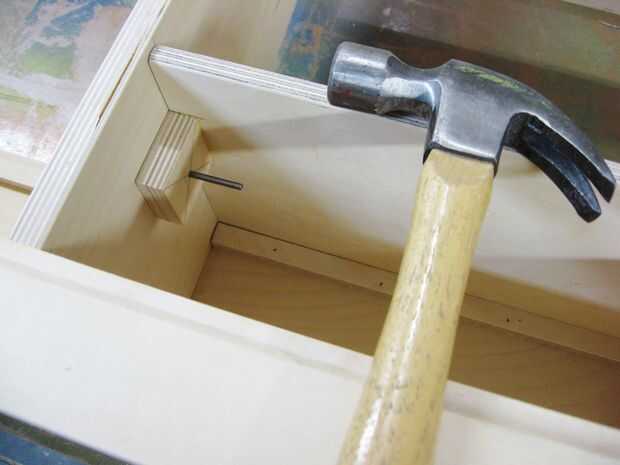 Los agujeros de perno de bisagra en los lados de la caja de la cabecera fueron cuidadosamente perforados a una profundidad medida para no perforar a través de las paredes exteriores, mientras que los agujeros del estante vertical soportan piezas se perforaron directo.