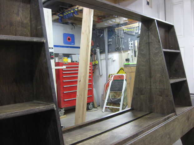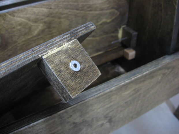 También se instalaron algunos topes para mantener las tapas del chasquido de los paneles posteriores o espejo cuando se abrió. En la sección central, éstos fueron hechos de pequeños bloques de madera con goma, pegada a las caras, que se atornillan en el lugar. En las secciones de lado, simplemente usé tornillos pequeños con tubos encogidos sobre las cabezas que se atornillan en el lugar del encogimiento del calor.