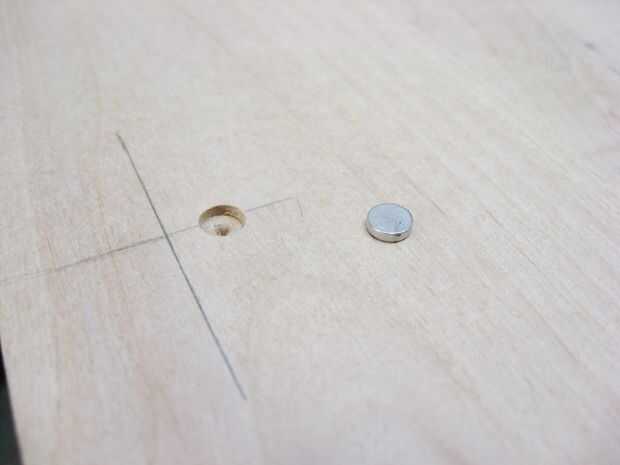 La parte superior e inferior del panel central y lugares adyacentes en el caso de tienen varios imanes de neodimio para sujetar el panel en su lugar. Lugares fueron cuidadosamente marcados, perforado con una broca forstner, y ajustaron los imanes en el lugar.