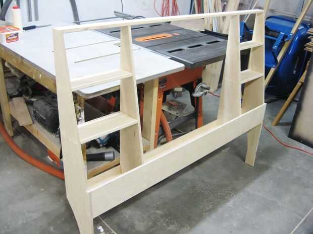 Los estantes y soportes verticales parcialmente se reunieron fuera de la caja, usando pegamento y clavo clavos de pistola.