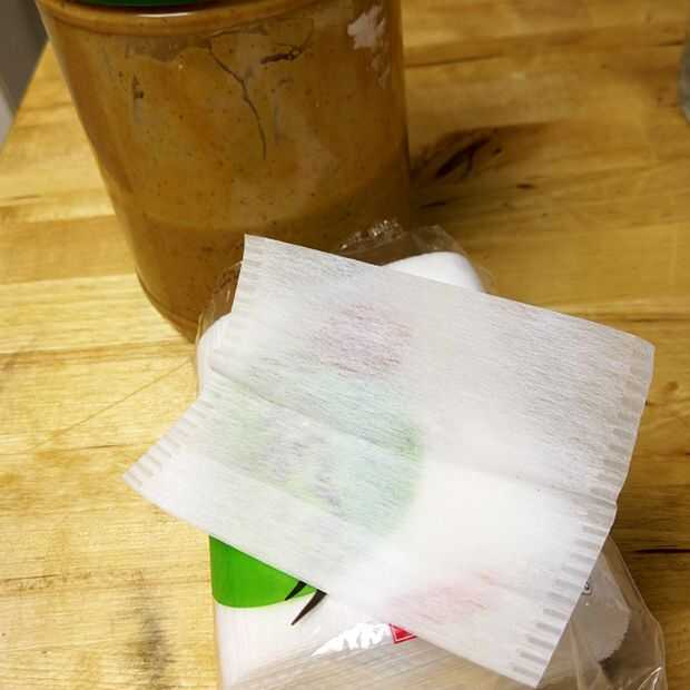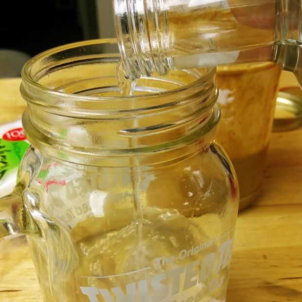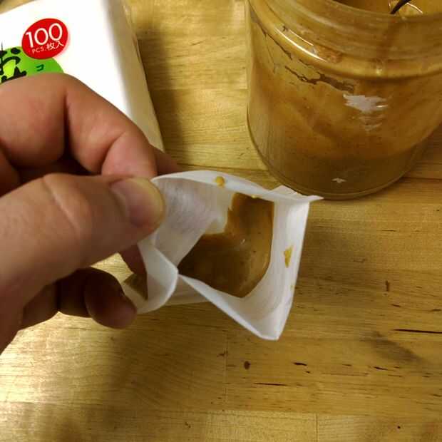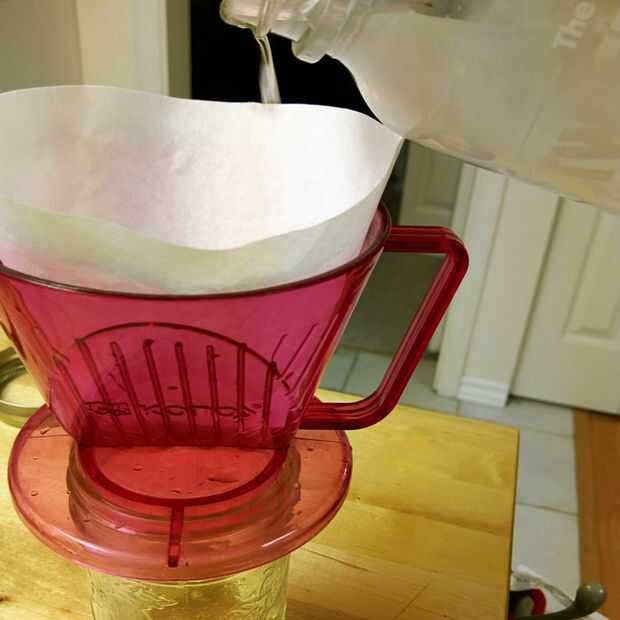 Ahora tienes un tarro de mantequilla de maní vodka. OH NO: habrá algunos inofensivo aceite de cacahuete flotando en la parte superior. La mejor manera que he encontrado para deshacerse de él es verter todo esto a través de un filtro de papel en un café pour-over. Esto puede ir directamente sobre un segundo tarro de masón que mantendrá en.