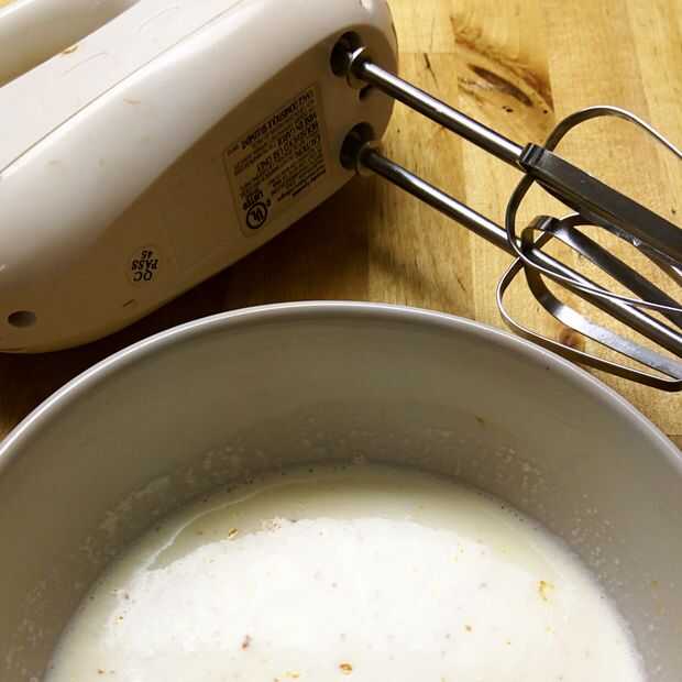 Ahora encienda su batidor y batir bien. Continuar hasta que formen picos tal como se muestra en la foto. Dejar de lado o poner en el refrigerador para más tarde.