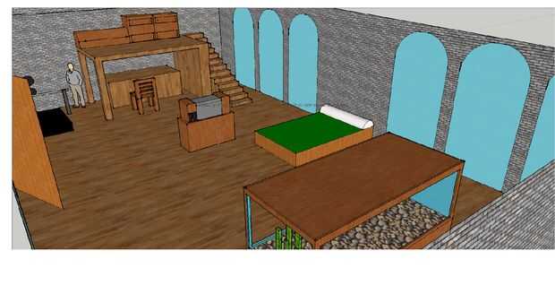 , en mi opinión, sería la mejor cueva de dormitorio o de hombre. También es mi primer intento en el uso de Google Sketchup. Mide 30 pies ancho y 50 pies largos, total. Dentro de esta habitación es una cama, un techo inclinado, una pecera, una radio con atril incorporado y metrónomo, una prensa de banco, un loft con almacenamiento en la parte superior accesible mediante una escalera con construido en librería y estación de carga. Por debajo del desván es un lugar de trabajo. Las paredes han arqueado las ventanas, con un mando a distancia por la puerta control de cortinas para atenuar las ventanas para mayor privacidad. Originalmente esta hecho para un concurso y mantenerlo ahora que otros pueden ser capaces de encontrar errores en este y aprender de ella o señalar por lo que puedo aprender. Gracias por ver!