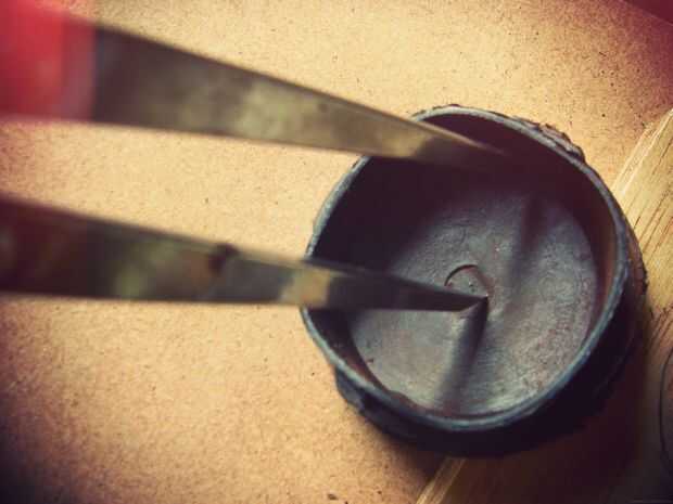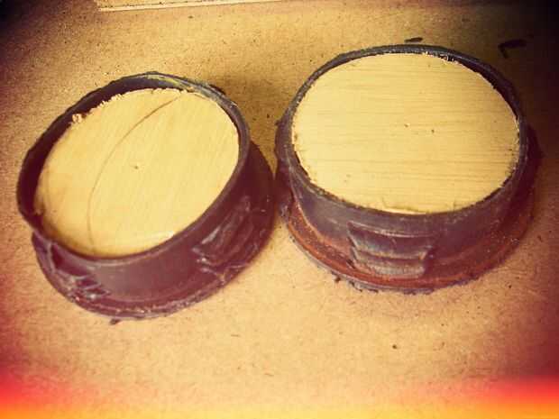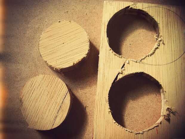 Marco de la cama tenía tapones de plástico para los pies. He quitado estos y cortar discos con un jig Sierra, para caber dentro de la madera contrachapada. Esto dejará los extremos del tubo de ser deformado bajo extrema presión.