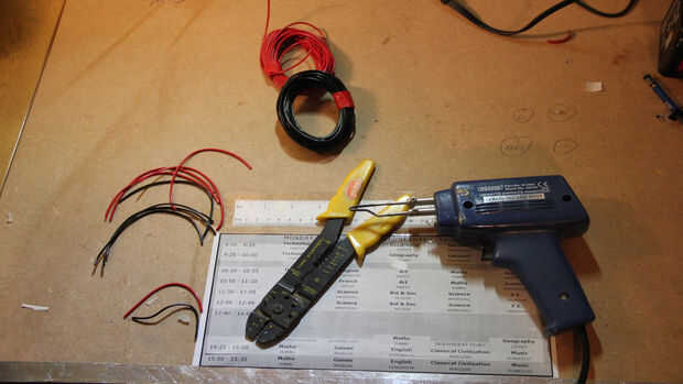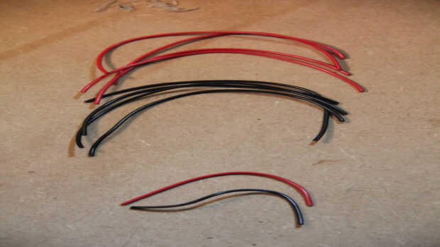 Con unos gruesos cables rojo y negro, corté trozos de 4 x 7 cm de cable negro y piezas de 4 x 7cm de cable rojo. Luego corté un trozo de 10cm de alambre negro y rojo. Me la pelaron ambos extremos de los cables.