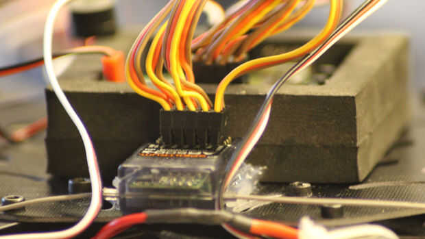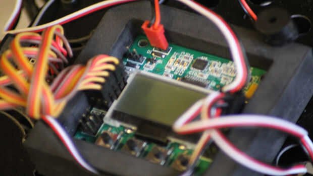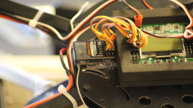 Sacar los cables y conectar los canales en el receptor a la Junta KK a través de los cables de servo que compramos. Las entradas están a la izquierda de la placa de servo. Los nombres de canal de arriba a abajo en el tablero KK son: