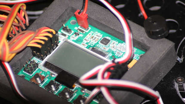 Adhiera la Junta kk, directamente en el centro de lo quadcopter. Asegúrese de que también señala directamente hacia adelante. Adelante en el KK Junta es cuando la pantalla es horizontal, y los cuatro botones en la parte inferior. Esto asegura que cuando usted dirigir va hacia delante, no un poco izquierda o derecha. El pegamento que se utiliza debe ser lo suficientemente fuerte para mantenerla permanentemente, pero asegúrese de que usar un montón. que no desea caer en el aire.