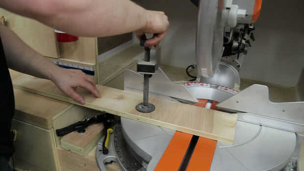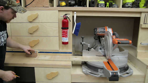 En este punto el tope es completa. Terminé usando un perno de WC y un pomo de plástico para la acción de bloqueo. Para establecer la posición exacta de la regla me puse el puntero en el centro de la ranura para permitir ajustes en ambas direcciones. Luego coloca una tabla de desecho contra la hoja de la sierra con el bloque de tope contra el otro extremo del tablero y hace una línea de referencia en la guía. Esta línea representa la medida del tablero utilizado. En mi caso era 33-7/8". (Foto 1)