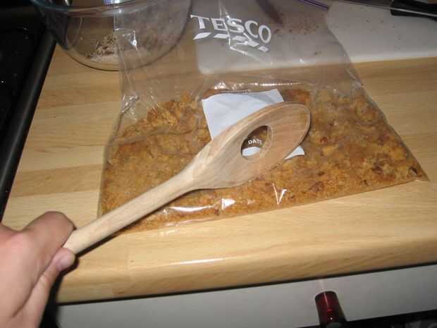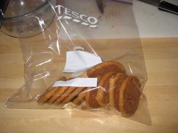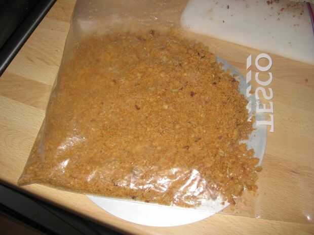 • En una bolsa Ziplock, poner 150g de galletas de su opción, la más sabrosa, mejor. Planeé en usando sólo hobnobs, pero vio el Tesco todas las cookies de nueces de mantequilla. Usé unos 5 hobnobs y 5 galletas de nuez. Selle la bolsa, duh. Proceder a aplastar y golpear la bolsa con cuchara de madera o martillo hasta que las galletas se trituran.