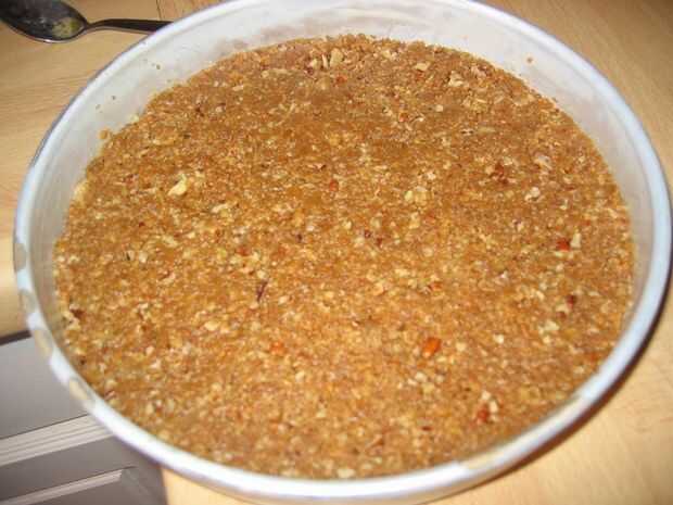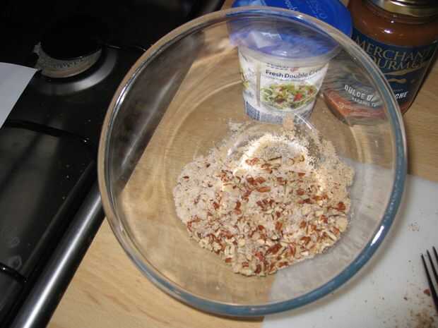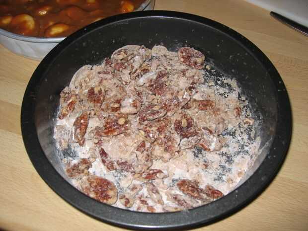 • Verter la mantequilla sobre la mezcla de nueces y revuelva. Después de hacer esto, creo que me uso un poco menos de mantequilla la próxima vez, pero experimentar. No verterlo todo en una vez. Mezcle un poco hasta que las migas realmente unir, y que debería ser derecho.