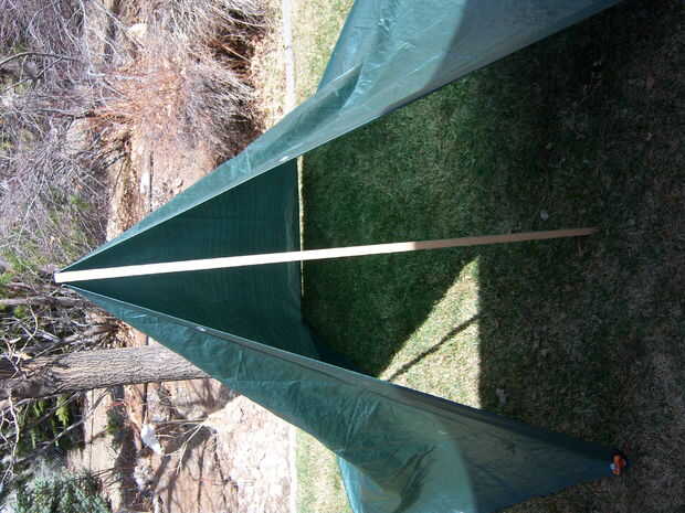 Jim Muskrat configura otro refugio de lona, esta vez utilizando un pimpollo doblado por un filo.