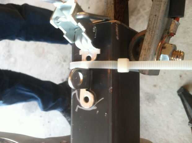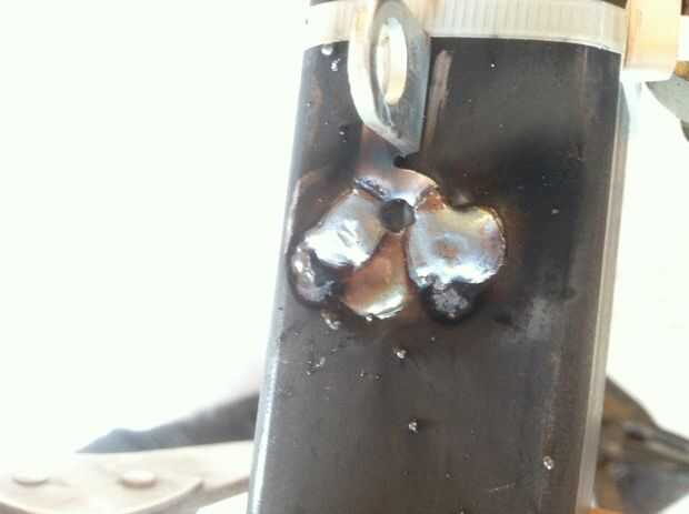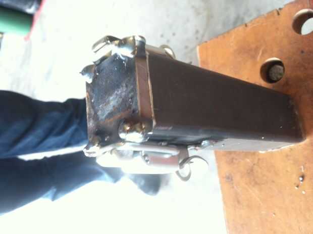 Luego, coloque la pinza en los lados del envase en las marcas que trazaste anteriormente. Soldar en pero asegúrese de que las soldaduras no interferirá con el sistema de fijación. Terminé de soldadura en la parte inferior de las mordazas, en y alrededor del agujero del tornillo. De esta manera las soldaduras serían robusto pero no afectaría a la eficacia de la abrazadera.