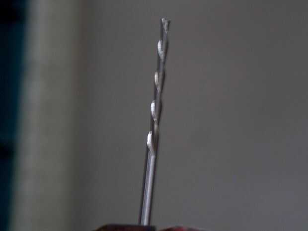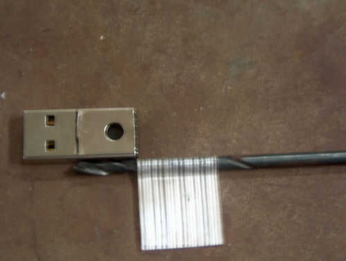 Después de tener el esquema de la unidad flash dibujado vas a envolver un poco de cartulina alrededor de la cornamenta. El cartón es bueno prevenir arañazos y marcas de vicios. Mientras tiene la cornamenta tal puede configurar sus brocas. Alinee el extremo de la broca con la marca que pones en carcasa de acero de la unidad flash. Una vez que los tengas en el empuje de la línea la broca de 1/8 de pulgada más allá de la línea. He encontrado a través de ensayo y error que demasiada profundidad es mejor en este caso, siempre puede agregar más epoxy. Una vez que tienes tu broca de 1/8 de pulgada más allá de la línea de aplicar cinta en el pedacito, dejándolo colgantes como una bandera. Esta es una excelente manera para marcar profundidad sin necesidad de utilizar una prensa del taladro.