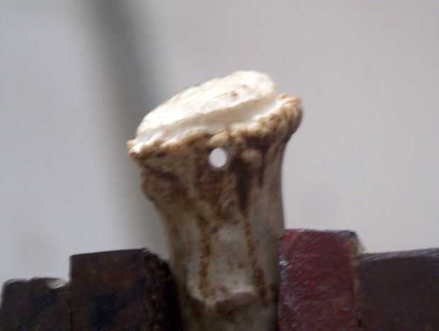 Una vez que tengas tu corte y lijado, voltear la pieza de asta de ciervo y perfore un orificio de 1/8 de pulgada a través de la cornamenta, asegurándose de que corre paralela al orificio de impulsión del flash, a menos que quieras una vista lateral de la unidad.