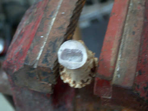 Una vez que tengas ambos de las brocas roscadas es hora de comenzar la perforación, no olvide recoger el polvo de la cornamenta. Comienzan perforar tres agujeros a lo largo de la duración de su marca rectangular, entonces usted puede ir con la broca de corte, ampliando los agujeros dentro de otra y a lo largo del contorno rectangular. Y no te preocupes si dejas accidentalmente la broca morder más de lo que quería, le sucede a todos nosotros. Es donde el epoxy y la cornamenta del polvo vienen más tarde. Una vez que termines de perforación hacia fuera del rectángulo, lijar la superficie de la cornamenta.