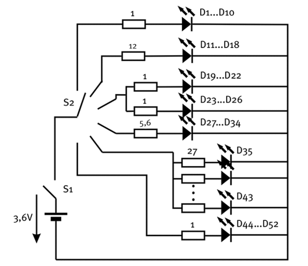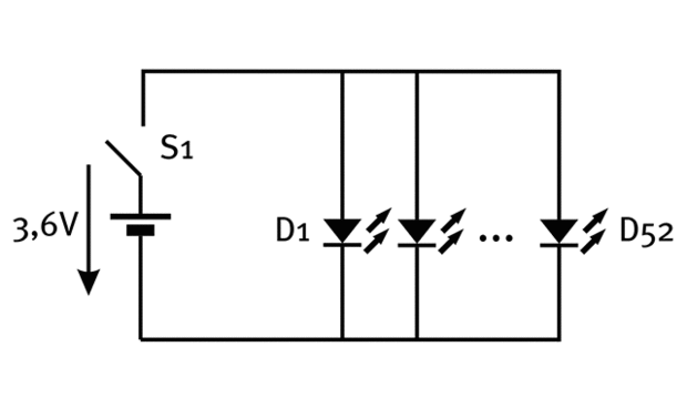 Como pretendo utilizar la antorcha principalmente con baterías recargables, calcula el siguiente circuito de 3,6 voltios, que es el voltaje típico de tres baterías de NiMH.