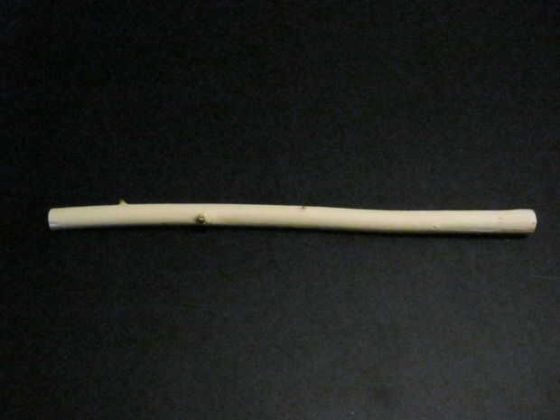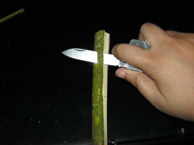 Después de toda la corteza exterior se ha ido, o incluso cuando la mayor parte de está, girar la hoja para que quede perpendicular a la palanca y suavemente raspe la materia pulposa. Y si notaste, dejé los nudos en donde ramitas poco ramificaron hacia fuera, a cuidar de los cuando la madera está seca. De lo contrario corren el riesgo de tener la hoja de la rama resbaladiza y terminan cortando a mí misma.