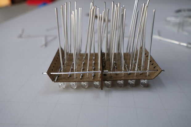 V-bares siempre se ejecutan en el exterior de los conductores del LED que se cruzan. Debe cepillar apenas pasado, pero usted puede doblar algunos de los cables en la base del LED si es necesario para obtener las barras de V para alinearse con los agujeros.