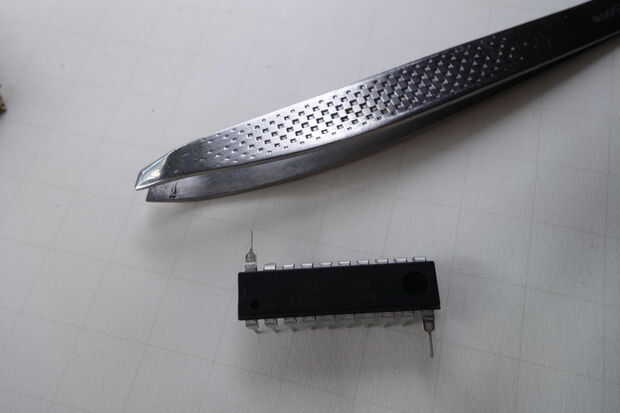 Utilice las pinzas para doblar hasta los pines de arriba a la izquierda y abajo a la derecha por lo que están pegando directamente hacia afuera a los lados.