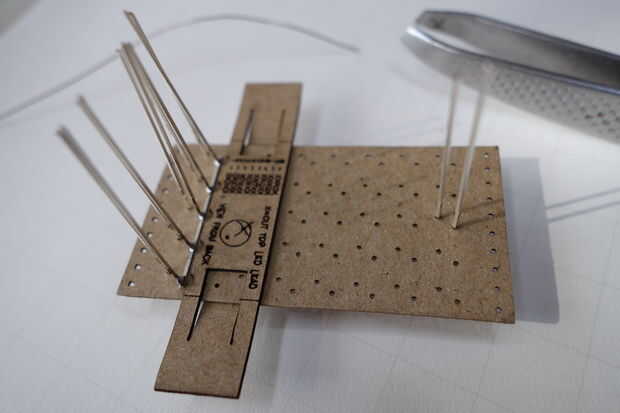 Deslice la plantilla de soldar en la placa matriz, de modo que empuja la barra de H contra los conductores.