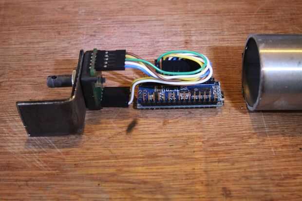 El codificador de Bourns tiene diez pernos en el exterior y un conjunto elaborado de contactos cepillados en el interior. Como la veleta gira, realiza un complicado conjunto de conecta y se desconecta que resulta en una salida binaria de 8 dígitos compuesto de ceros y unos. Estos números binarios son entonces procesados por un pequeño arduino 'Nano' dentro del cuerpo de la paleta de viento y en comparación con una 'tabla de la verdad' suministrado por el fabricante del codificador. Más de diez minutos se hacen lecturas periodo 1.200 y cada dirección de viento separados registrado se agrega hasta el trabajo que la dirección es la más común - es el valor de 'Modo'. Este valor de modo se transmite por la frecuencia de pulsado abajo de un cable a otro arduino en el cuadro de la estación principal y la frecuencia es medida y convertida en un número entero entre 0 y 360.