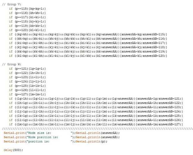 <p>int p=0;<br> unsigned long n=0; int answerAA =0; int answerAB; // Change this to an int for debugging. int count=0; int resetNanoStatus; const int ledPin = 13; // the pin that the LED is attached to int callBackFromMaster = 11; // Tone output on pin 10. int val1 =0; int resetStatus = LOW; int aa=0; int ab=0; int ac=0; int ad=0; int ae=0; int af=0; int ag=0; int ah=0; int ai=0; int aj=0; int ak=0; int al=0; int am=0; int ba=0; int bb=0; int bc=0; int bd=0; int be=0; int bf=0; int bg=0; int bh=0; int bi=0; int bj=0; int bk=0; int bl=0; int ca=0; int cb=0; int cc=0; int cd=0; int ce=0; int cf=0; int cg=0; int ch=0; int ci=0; int cj=0; int ck=0; int cl=0; int ea=0; int eb=0; int ec=0; int ed=0; int ee=0; int ef=0; int eg=0; int eh=0; int ei=0; int ej=0; int ek=0; int el=0; int fa=0; int fb=0; int fc=0; int fd=0; int fe=0; int ff=0; int fg=0; int fh=0; int fi=0; int fj=0; int fk=0; int fl=0; int ga=0; int gb=0; int gc=0; int gd=0; int ge=0; int gf=0; int gg=0; int gh=0; int gi=0; int gj=0; int gk=0; int gl=0; int ha=0; int hb=0; int hc=0; int hd=0; int he=0; int hf=0; int hg=0; int hh=0; int hi=0; int hj=0; int hk=0; int hl=0; int ia=0; int ib=0; int ic=0; int id=0; int ie=0; int iff=0; int ig=0; int ih=0; int ii=0; int ij=0; int ik=0; int il=0; int ja=0; int jb=0; int jc=0; int jd=0; int je=0; int jf=0; int jg=0; int jh=0; int ji=0; int jj=0; int jk=0; int jl=0; int ka=0; int kb=0; int kc=0; int kd=0; int ke=0; int kf=0; int kg=0; int kh=0; int ki=0; int kj=0; int kk=0; int kl=0; int la=0; int lb=0; int lc=0; int ld=0; int le=0; int lf=0; int lg=0; int lh=0; int li=0; int lj=0; int lk=0; int ll=0; int lm=0; void setup() { pinMode(ledPin, OUTPUT); //start serial connection Serial.begin(115200); pinMode(2, INPUT_PULLUP); pinMode(3, INPUT_PULLUP); pinMode(4, INPUT_PULLUP); pinMode(5, INPUT_PULLUP); pinMode(6, INPUT_PULLUP); pinMode(7, INPUT_PULLUP); pinMode(8, INPUT_PULLUP); pinMode(9, INPUT_PULLUP); // tone is on pin 10 pinMode(11, INPUT_PULLUP); // Call back from Master. pinMode(13, OUTPUT); String d; } void loop() { resetValues(); tone (10,100+50*answerAB,50); count =count+1; int columnOne = digitalRead(9); int columnTwo = digitalRead(2); int columnThree = digitalRead(3); int columnFour = digitalRead(4); int columnFive = digitalRead(5); int columnSix = digitalRead(6); int columnSeven = digitalRead(7); int columnEight = digitalRead(8); // Serial.print("Integers = "); // Serial.print(columnOne); // Serial.print(columnTwo); // Serial.print(columnThree); // Serial.print(columnFour); // Serial.print(columnFive); // Serial.print(columnSix); // Serial.print(columnSeven); // Serial.println(columnEight); // Serial.print("n = ");Serial.println(n); String d = String(columnOne)+String(columnTwo)+String(columnThree)+String(columnFour)+String(columnFive)+String(columnSix)+String(columnSeven)+String(columnEight); // Serial.print("data in string format = ");Serial.println(d); // Serial.print("count = ");Serial.println(count); n = d.toInt(); if (n==10011000){p=6;} if (n==10011111){p=17;} if (n==10000111){p=29;} if (n==10010111){p=30;} if (n==10001111){p=34;} if (n==10001110){p=35;} if (n==10000011){p=68;} if (n==10001011){p=69;} if (n==10001001){p=70;} if (n==10000001){p=71;} if (n==10000000){p=72;} if (n==10000100){p=73;} if (n==10010100){p=74;} if (n==10010000){p=121;} if (n==10010010){p=122;} if (n==10011010){p=123;} if (n==10011110){p=124;} if (n==10111000){p=5;} if (n==10101111){p=15;} if (n==10111111){p=16;} if (n==10100100){p=26;} if (n==10100110){p=27;} if (n==10100111){p=28;} if (n==10101001){p=59;} if (n==10100011){p=67;} if (n==10111100){p=110;} if (n==10111110){p=111;} /////////////////////////////////////////// if (n==11111110){p=112;} if (n==11010100){p=75;} if (n==11110100){p=76;} if (n==11110000){p=77;} if (n==11110010){p=78;} if (n==11111010){p=79;} if (n==11111011){p=80;} if (n==11111001){p=81;} if (n==11110001){p=82;} if (n==11010001){p=83;} if (n==11000001){p=84;} if (n==11000101){p=85;} if (n==11000100){p=86;} if (n==11000000){p=87;} if (n==11111101){p=96;} if (n==11111100){p=97;} if (n==11111000){p=98;} if (n==11101000){p=99;} if (n==11100000){p=100;} if (n==11100010){p=101;} if (n==11101001){p=60;} if (n==11100001){p=61;} if (n==11100101){p=62;} if (n==11110101){p=63;} if (n==11110111){p=64;} if (n==11110011){p=65;} if (n==11100011){p=66;} if (n==11010011){p=44;} if (n==11000011){p=45;} if (n==11001011){p=46;} if (n==11101011){p=47;} if (n==11101111){p=48;} if (n==11100111){p=49;} if (n==11000111){p=50;} if (n==11010111){p=31;} if (n==11011111){p=32;} if (n==11001111){p=33;} ///////////////////////////////////////// if (n==111111){p=1;} if (n==111110){p=2;} if (n==111010){p=3;} if (n==111000){p=4;} if (n==11000){p=7;} if (n==1000){p=8;} if (n==1111){p=13;} if (n==101111){p=14;} if (n==11111){p=18;} if (n==11101){p=19;} if (n==11100){p=20;} if (n==1100){p=23;} if (n==100){p=24;} if (n==100100){p=25;} if (n==1110){p=36;} if (n==101110){p=37;} if (n==100110){p=38;} if (n==110){p=39;} if (n==10){p=40;} if (n==10010){p=41;} if (n==111){p=52;} if (n==10111){p=53;} if (n==10011){p=54;} if (n==11){p=55;} if (n==1){p=56;} if (n==1001){p=57;} if (n==101001){p=58;} if (n==100000){p=104;} if (n==100001){p=105;} if (n==100101){p=106;} if (n==110101){p=107;} if (n==111101){p=108;} if (n==111100){p=109;} if (n==110001){p=118;} if (n==110000){p=119;} if (n==10000){p=120;} if (n==11110){p=125;} //////////////////////////////////////// if (n==1001000){p=9;} if (n==1001001){p=10;} if (n==1001101){p=11;} if (n==1001111){p=12;} if (n==1111111){p=0;} if (n==1011100){p=21;} if (n==1001100){p=22;} if (n==1010010){p=42;} if (n==1010011){p=43;} // Take the front 0 off. if (n==1000111){p=51;} if (n==1000000){p=88;} if (n==1000010){p=89;} if (n==1001010){p=90;} if (n==1101010){p=91;} if (n==1111010){p=92;} if (n==1111000){p=93;} if (n==1111001){p=94;} if (n==1111101){p=95;} if (n==1100010){p=102;} if (n==1100000){p=103;} if (n==1111110){p=113;} if (n==1111100){p=114;} if (n==1110100){p=115;} if (n==1110000){p=